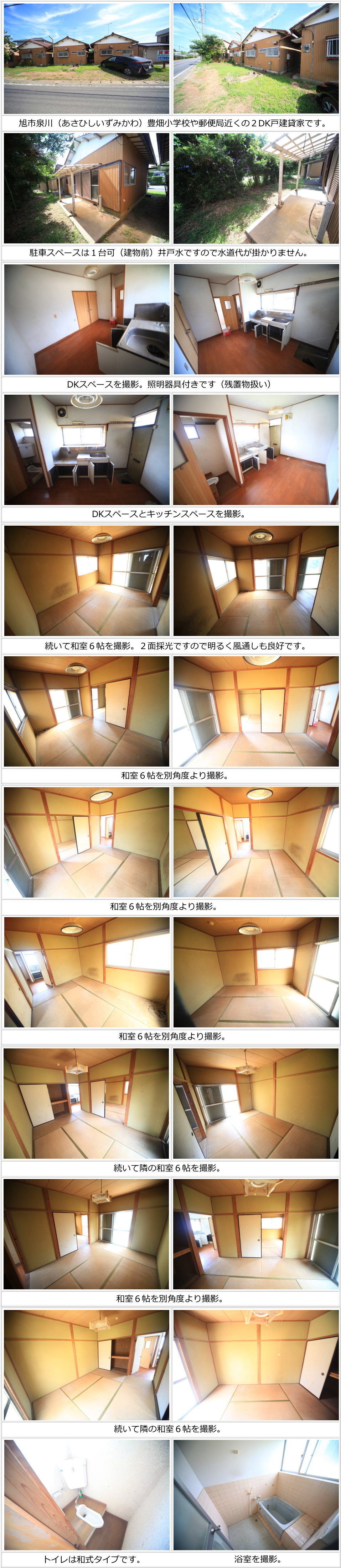 | ■物件ひとことメモ:泉川郵便局近くの2DK戸建貸家です。駐車1台可!井戸水ですので水道代が掛かりません。※井戸水の水質保証はありません。現況有姿での賃貸借です。※小修繕等は全て借主負担となります。 |