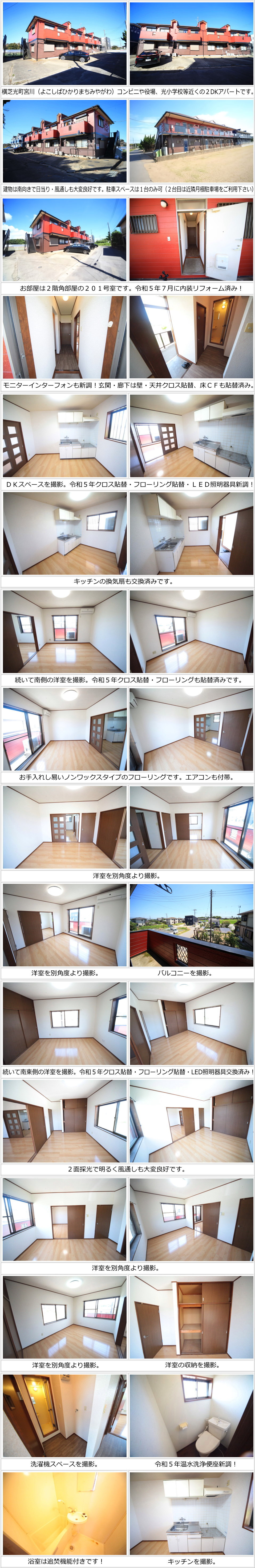 | ■物件ひとことメモ:賃料を値下げしました!横芝光町役場や光小学校、コンビニ等近くの2階角部屋2DKアパートです。お部屋は南向きで日当り・風通しも大変良好です。エアコン1台、照明器具、追焚機能、モニターインターフォン付きです。令和5年7月に内装をリフォーム済みですのでとてもキレイです!駐車スペースは1台分のみ可能(2台目は近隣月極駐車場をご契約下さい) ■リフォーム内容 令和5年7月 DK・廊下・洋室クロス貼替 DK・洋室2部屋フローリング貼替 廊下床クッションフロア貼替 キッチン換気扇交換 LED照明器具交換 モニターインターフォン 温水洗浄便座交換 追焚機能追加 |