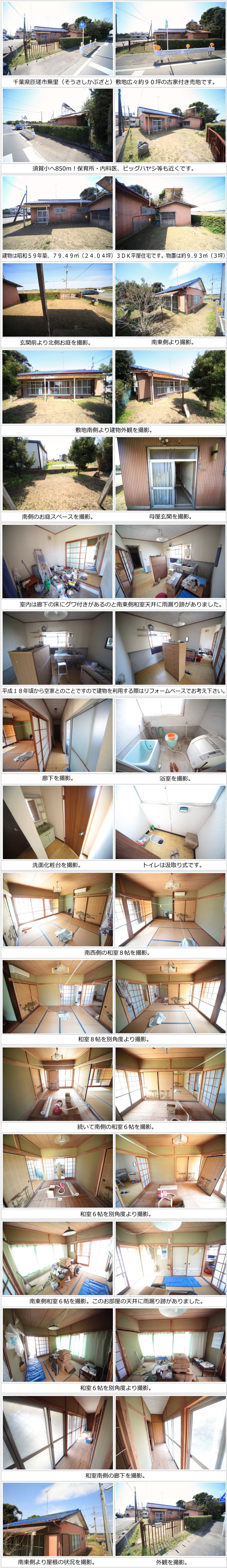 | 物件所在 | 匝瑳市蕪里(そうさしかぶざと) | 販売価格 | 650万円 現況坪単価約71,570円 |