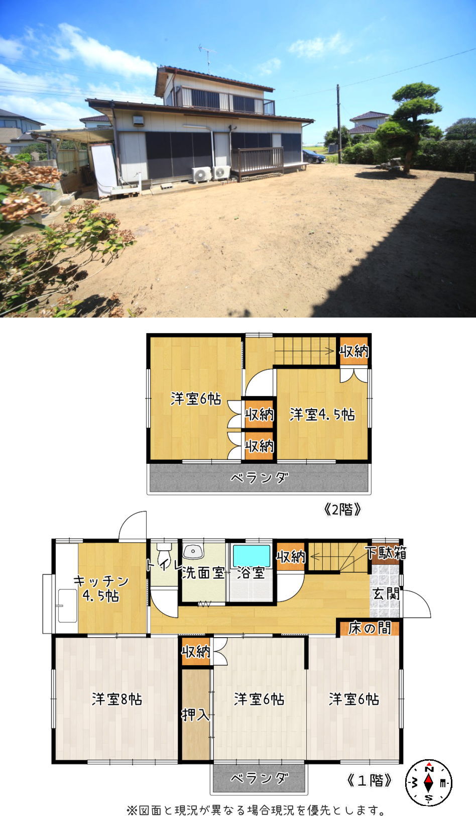 | ■物件ひとことメモ:スーパーやコンビニ・須賀小学校へも近くの敷地広々約74坪の5K中古住宅です。令和6年頃に1階床貼替等内装を一部リフォーム済みです。建物は南向きで日当り・風通しも大変良好!駐車スペースは建物南側のお庭スペースに2~3台程度ご利用可能です。物件近隣に用水路・軽桶川がありますので小さなお子様がいらっしゃる場合要注意。 ■リフォーム内容 1階3部屋床貼替 1階壁一部クロス貼替 2階洋室4.5帖壁一部クロス貼替等 |