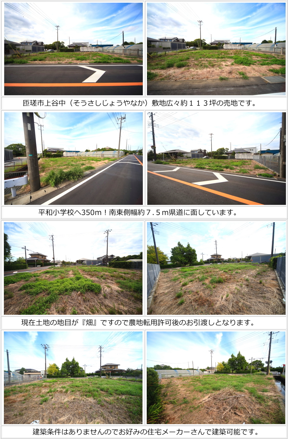 | ■土地物件ひとことメモ:平和小学校や保育所近く!敷地広々約113坪の売地です。南東側公道に面し日当り良好!建築条件もありませんのでお好みの住宅メーカーさんで建築可能です。県道に面していますので住宅のほか事務所や店舗等の事業用としても好適!※要農地転用許可 |