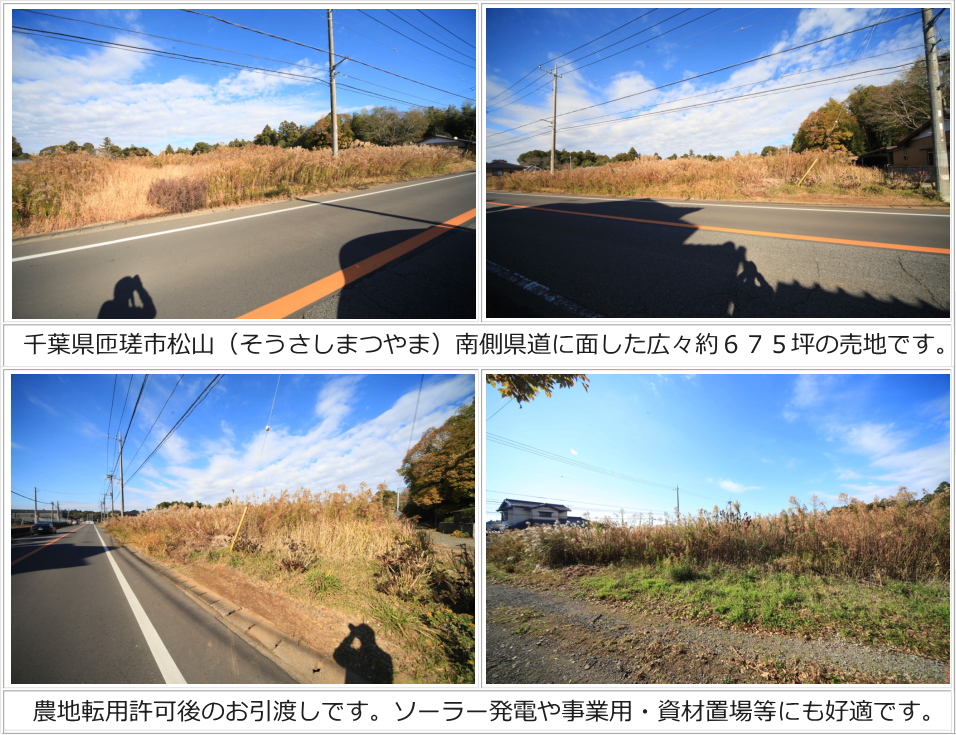 | ■土地物件ひとことメモ:敷地広々約675坪!事業用地や資材置場・太陽光発電用地等にも好適な売地です。南側県道に面しています。※農地転用許可後のお引渡しです。※分割は不可です。 |