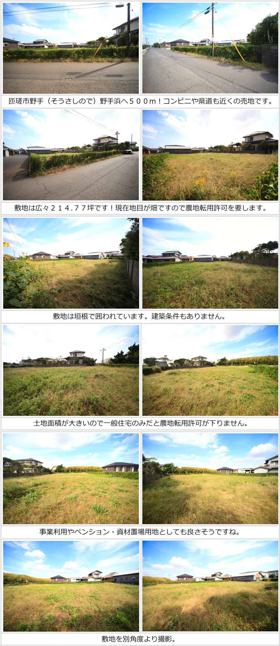 | ■土地物件ひとことメモ:野手浜へ約500m!ペンションや事業利用・資材置場等にも好適な広々した214坪の売地です。県道へも近くアクセス面も良好です。建築条件もありませんのでお好みの住宅メーカーさんで建築可能です。※農地転用許可を要します。一般住宅のみだと農地転用許可は下りません。 |