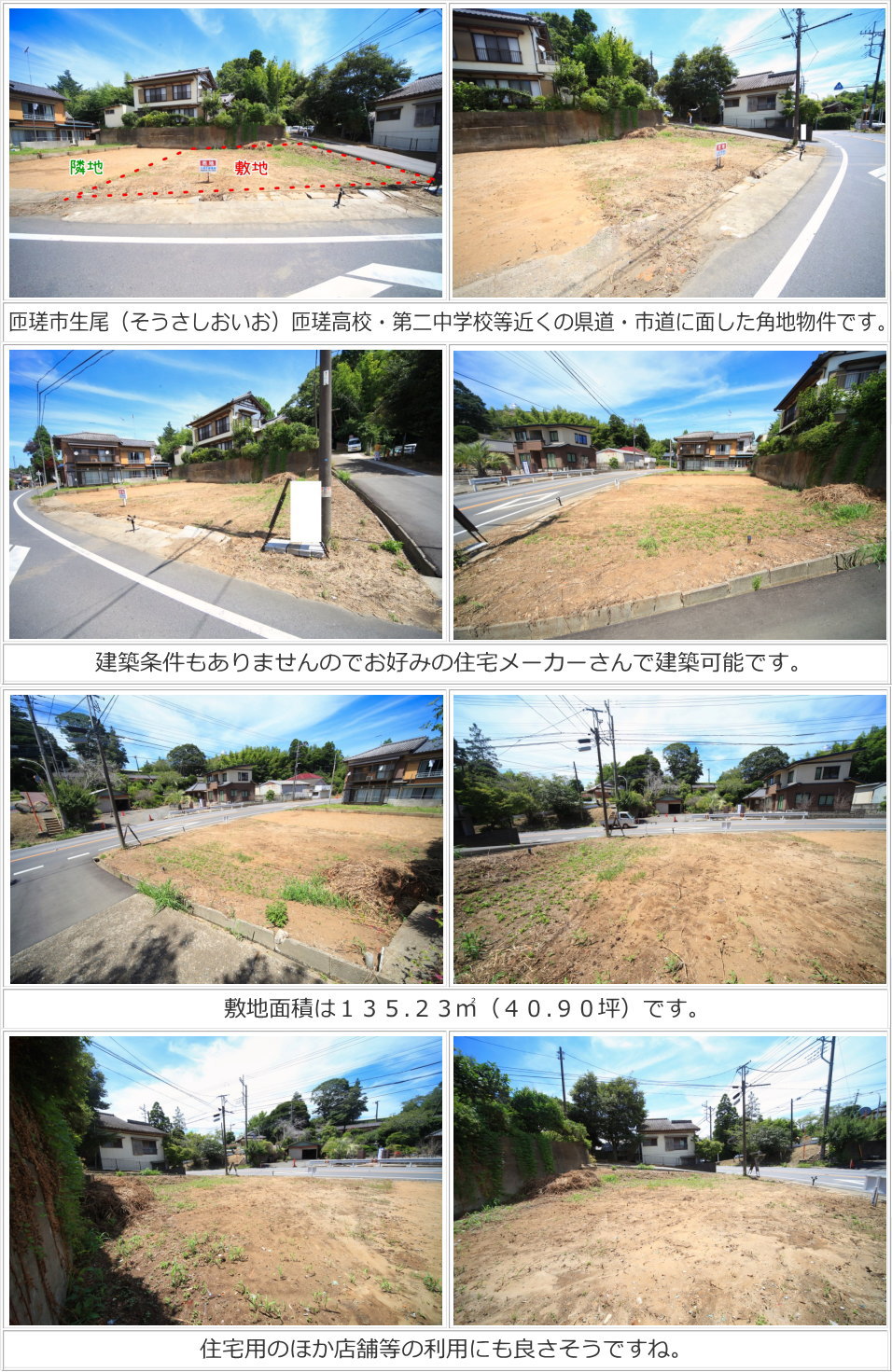 | ■土地物件ひとことメモ:八日市場第二中学校や匝瑳高校等近く子育てや生活環境良好な立地です。南側市道・西側県道に面した角地物件ですので店舗用地等にも好適です。建築条件もありませんのでお好みの住宅メーカーさんで建築可能です。 |