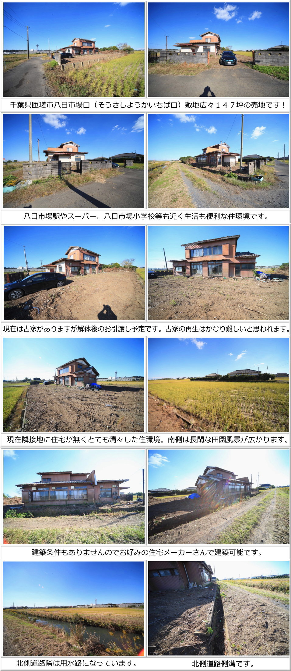 | ■土地物件ひとことメモ:八日市場駅や八日市場小学校、コンビニ・カインズホーム・ベイシア等近く生活便利な住環境の広々147坪の売地です!現在隣接地に住宅が無くとても清々とした住環境です!敷地南側は長閑な田園風景が広がります。日当り・風通しも大変良好!現在古家がありますが解体・更地渡し予定です(土留めは現況渡しです)建築条件もありませんのでお好みの住宅メーカーさんで建築可能です。 |