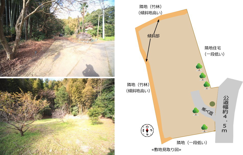 | ■接道 | 敷地東側幅約4.5m公道に間口21m接道 | ■他法令制限 | 文化財包蔵地域内 建築時ガケ条例適用の可能性有 |