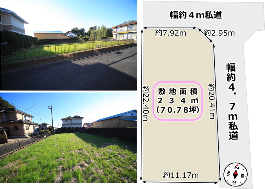 | 接道 | 東側幅約4.7m私道と北側幅約4m私道の角地 | 法令制限 | 文化財包蔵地域内:名木遺跡 |