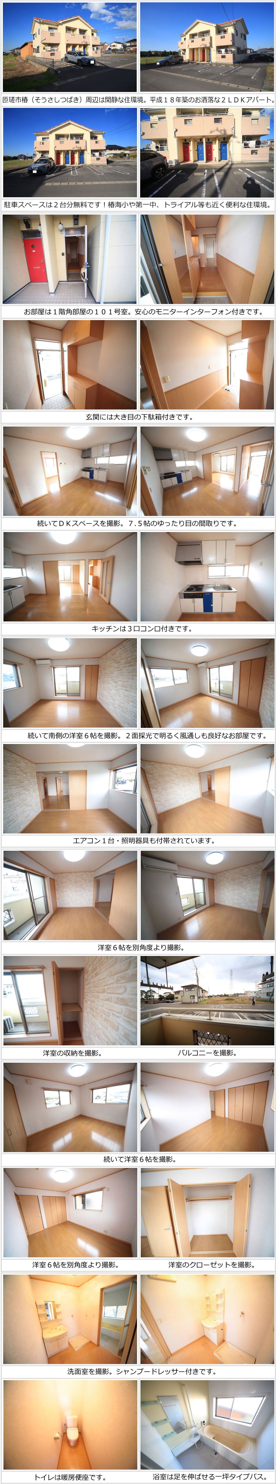 匝瑳市椿2DKアパート『サンレジュアリー101号室』のお部屋紹介動画は下記をクリック♪アパートや貸家等の賃貸物件情報を動画でご紹介します!YouTubeチャンネルに賃貸物件動画を随時更新中です。 |