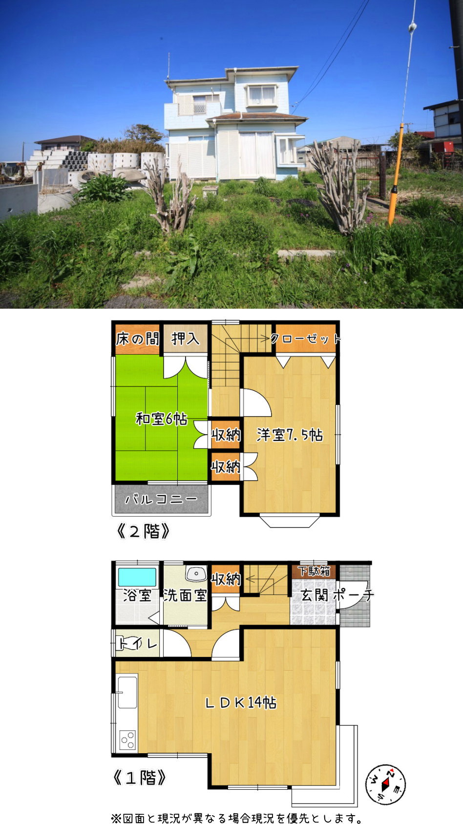 | ■物件ひとことメモ:新堀浜450m!海近くの2LDK中古住宅です。別荘利用やリゾート・サーフ基地等の利用に好適です。建物は南向きで日当り・風通しも大変良好!窓も多く明るく広々した14帖のLDK!2階も洋室7.5帖と和室6帖のゆとりある間取りです。隣接地に住宅が無く隣家等を気にせず暮らせそうなお宅です。※近隣コンクリート二次制作製造工場の作業車などの音があります。 |