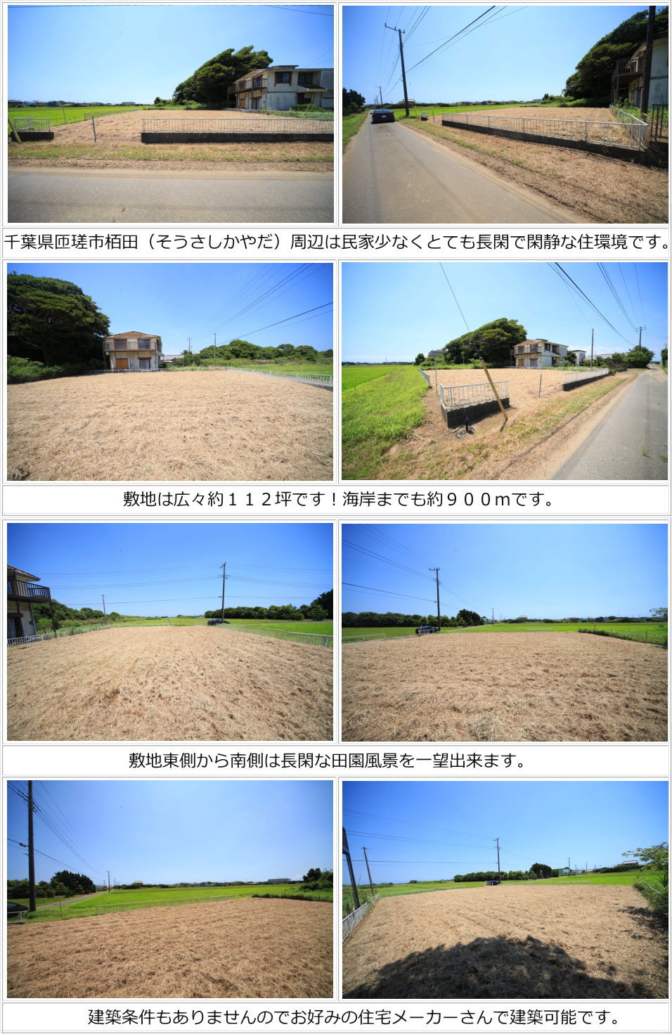 | ■土地物件ひとことメモ:海岸まで約900m!周辺は田園風景を一望出来る長閑な住環境。別荘利用や田舎暮らし等でのご利用に好適な広々112坪の売地です。建築条件もありませんのでお好みの住宅メーカーさんで建築可能可能です。 |