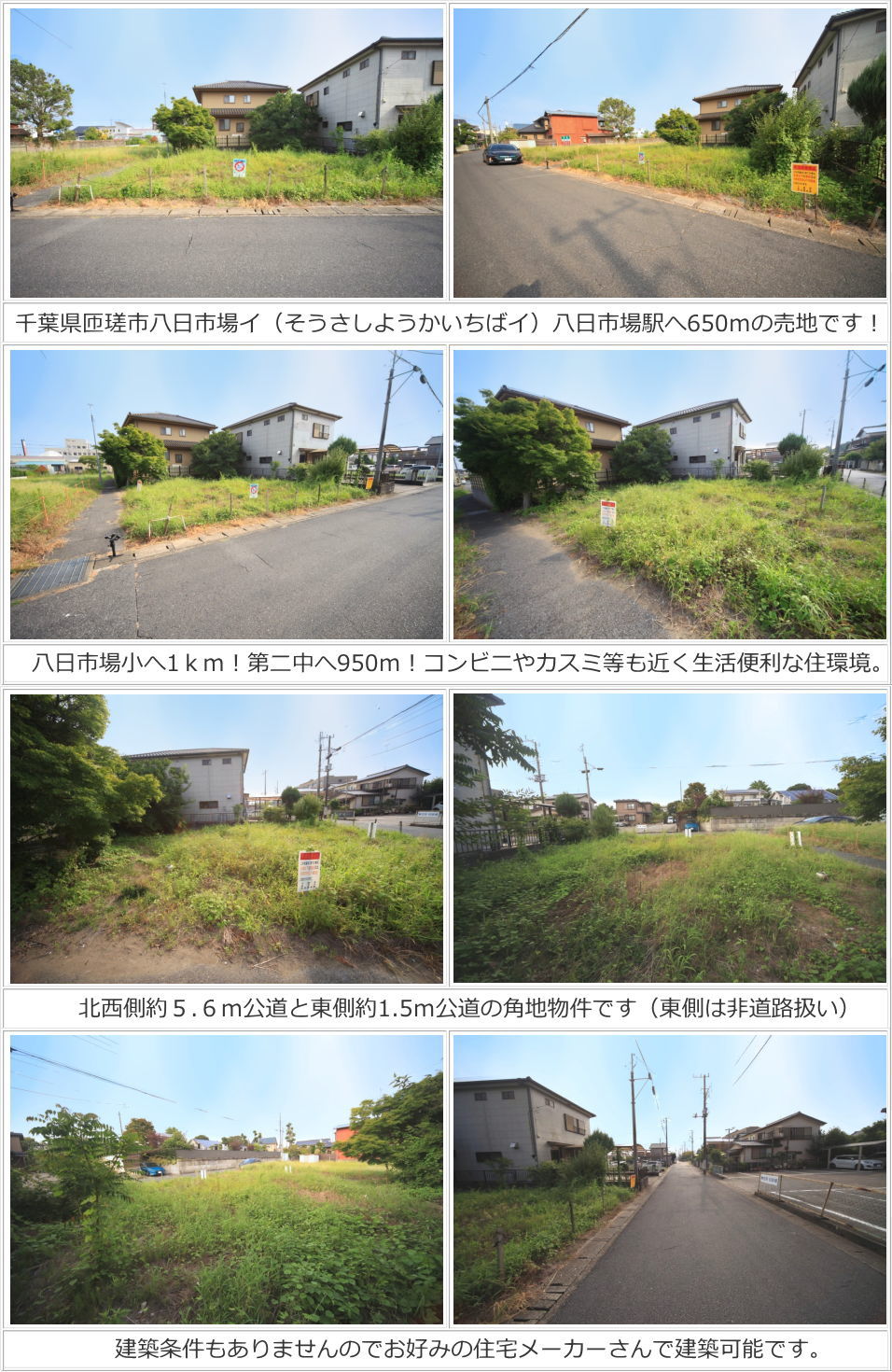 | ■土地物件ひとことメモ:八日市場駅へ650m!八日市場小学校や第二中学校へも近く!コンビニやカスミ・市民病院へも近く生活便利な住環境の60.35坪の売地です。北西側・東側公道に面した角地物件!建築条件もありませんのでお好みの住宅メーカーさんで建築可能です。 |
