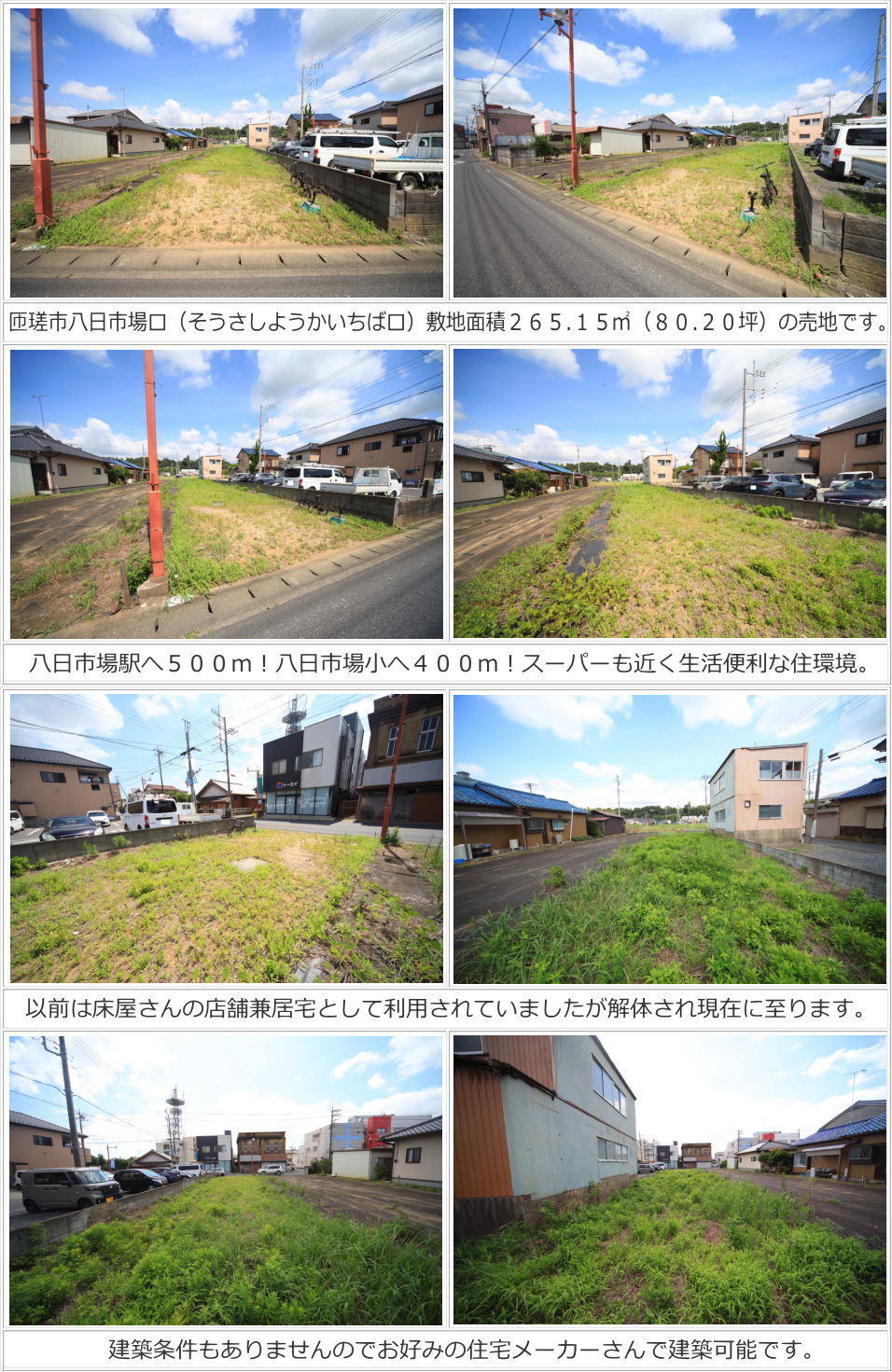 | ■土地物件ひとことメモ:八日市場駅や八日市場小学校、中学校・カインズホーム・ベイシア等も近く生活や通学等も便利な住環境の約80坪の売地です。建築条件もありませんのでお好みの住宅メーカーさんで建築可能です。以前は床屋さんの店舗兼居宅として利用されていました。小規模店舗や事業利用にも好適です。小中学校やスーパー・市役所へも近くですので収益物件用地としても良さそうです。 |